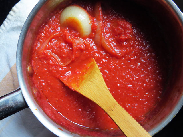 - Bring to a simmer over medium heat, then turn heat to low for 45 minutes. Stir occasionally, crushing the tomatoes on the side of the pan with a wooden spoon.