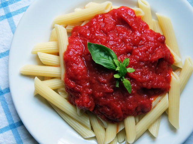 This recipe originated with Marcella Hazan, I’ve been reading about it on various food blogs for years. All you need are three ingredients, a can of San Marzano tomatoes, an onion, and butter to make an amazing gravy. Simmer time is 45 minutes, so it’s relatively quick to put together. So good, and yet so simple!