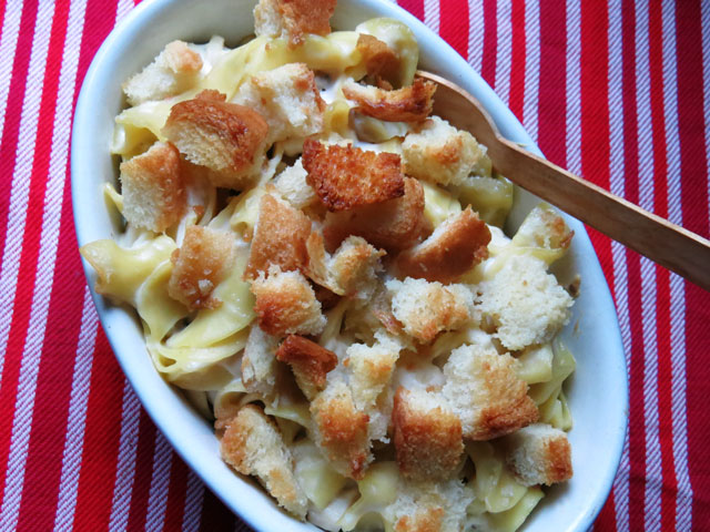 - In a medium bowl, toss the bread cubes with the melted butter, and spoon them over the noodles. Bake for 20 to 25 minutes. Serves 6.