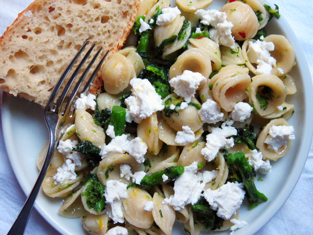 The name orecchiette comes from the Italian orecchia meaning ‘ear’, and –etta, meaning ‘small’. I like to think of them as miniature bowls that hold the creamy goat cheese and garlicky broccoli rabe in this dish.