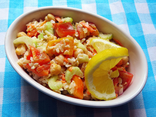 It’s the perfect summer side dish, but on it’s own, it also makes a terrific brown bag lunch. Red and orange peppers, cucumbers, carrots, celery, red onions, chickpeas, and brown rice tossed in a creamy dressing with fresh lemon juice and garlic. You get your daily dose of veggies, fiber, and being that swimsuit season is right around the corner – you’ll be beach ready in no time!