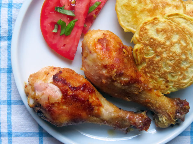 This is an easy to throw together weeknight dinner – what I refer to as a cheat. Chicken legs tossed in a spiced up version of Bisquick Baking Mix, and baked on a hot, buttered pan in the oven. Ready to go in less than an hour – while they were baking, I used up leftover corn and made some fritters.