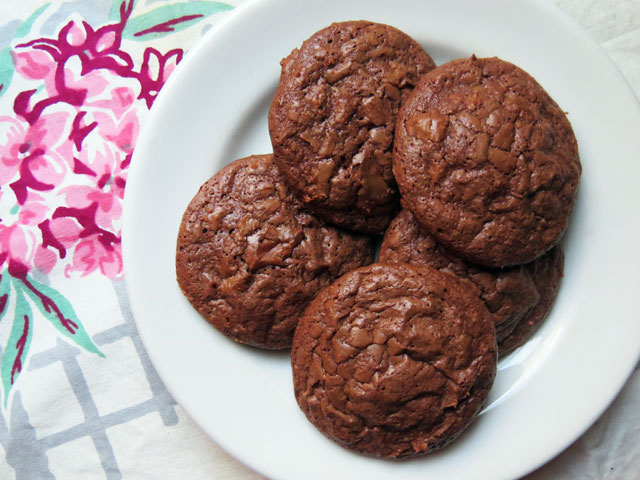 These cookies are like a brownie in cookie form – chewy, but slightly crispy -and very chocolate! I made them for the lifeguards at our pool, but it looks like I’m going to have to make another batch, because they seem to be evaporating in my kitchen!