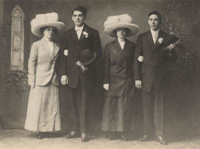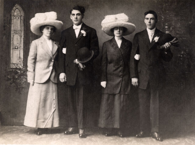 Another family photo restoration – although I’m not certain if these folks are relations or friends of my grandparents. It looks like a special occasion – perhaps a wedding since they’re dressed to the nines – the men in white ties, with corsages, gloves, and bowler hats. I did a bit of research, and discovered the women’s huge, broad-brimmed hats trimmed with masses of feathers were worn in mid-decade. Whatever the occasion, these folks saw fit to capture the event on film one hundred years ago.