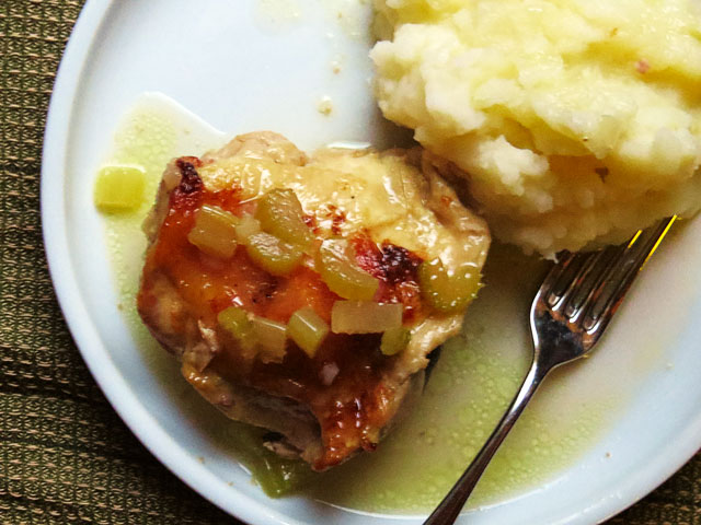 - Bake for 45 minutes, until the meat is tender and the top of the chicken is golden brown. Serve with mashed potatoes.