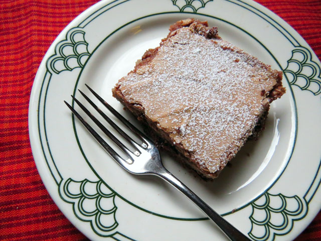 At the last minute, I threw this cake together to go with our anniversary dinner. Not much to look at, but it got rave reviews from the fellas. It’s a cheat, you start with a box cake mix, then add cream cheese, eggs, confectioners sugar to make it a layered dessert – very chocolatey, gooey, and delish!