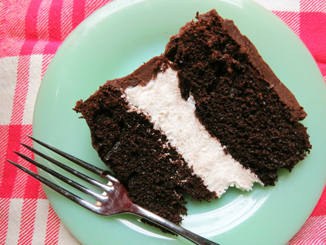 This is the cake I made for Joe’s birthday. It’s a rich chocolate cake with a cream filling, covered with chocolate ganache. This recipe is going into the permanent birthday cake collection – it was delicious!