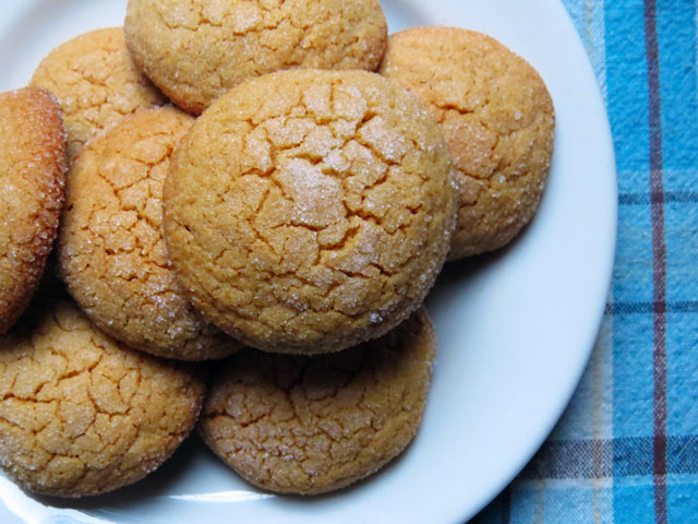 - Line a baking pan with parchment paper. Scoop tablespoons of dough, roll into a ball, and dip into the granulated sugar. Place balls 2″ apart on the baking sheet. Bake for 12 minutes, until cookies puff up, brown around the edges, and crackle on top. Let cookies cool for 5 minutes, then transfer to a wire rack. Makes 12 to 15 cookies.