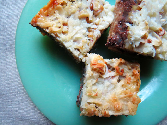 Hello Dolly bars are chocolate chips, nuts, and coconut layered on a graham cracker base. The whole shebang is then drizzled with sweetened condensed milk and baked. Not only are these bars delicious, they take no time to assemble. These bars are rich, so cut them into small squares.