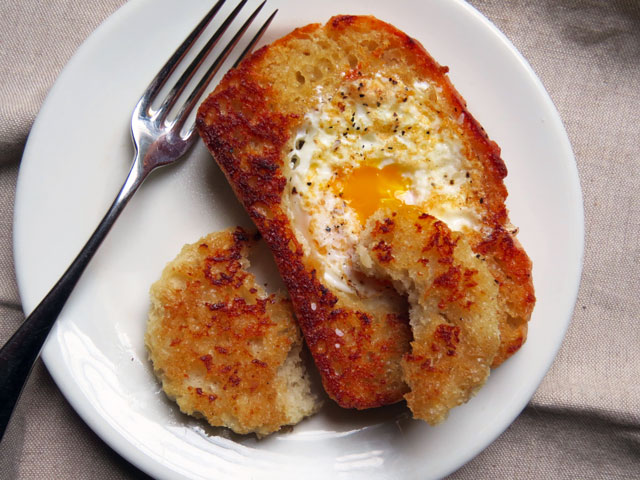 Use a cookie cutter or a glass to cut a hole from the center of a slice of the bread. Melt some butter in a hot skillet and add the bread and cutout. When it’s toasted, flip over – add some more butter in the hole of the bread and crack a large egg in the center, turn down heat to medium. When the eggs are white and set, about 2 to 3 minutes, I like to flip it for about 30 seconds so it’s over easy style.