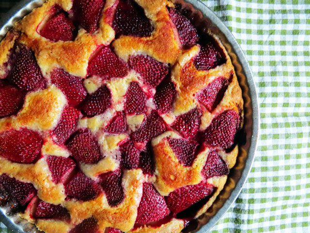 The strawberries at the market this weekend were gorgeous. I initially thought of baking a pie to follow our burgers and ribs – however, being short on time to make and chill pie dough, I decided on a cake instead. This is my go to recipe, besides the strawberries, the ingredients here are simple pantry staples. Quick to mix, the results are heavenly – the strawberries get all jammy and the texture of the cake is light. This is sure to be your heavy in rotation summer cake!