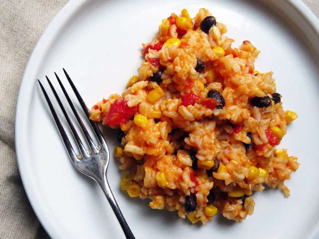 I’m always looking for ways of using leftover chicken. What’s wonderful about this dish with the exception of the chicken and cheese, all of the other ingredients – corn, Rotel tomatoes, black beans, enchilada sauce – can be pulled from your pantry. This could easily feed four people with leftovers for lunch the next day, which is great because it’s delicious!