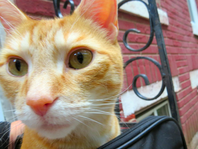 Lots of people walk their dogs, some of them see Plywood and bark and pull on their leashes. The cat doesn’t flinch. He sort of looks at them like – “You’re a dumb dog, I don’t have time for you.”