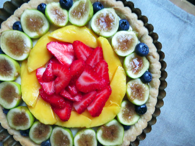Yesterday was our friend Anthony’s birthday. He suggested a fruit tart in lieu of a cake – I was on it! I found gorgeous, green figs in the market, a mango that was perfectly ripe, and strawberries and blueberries – the last vestiges of summer. The combo of fruit, the sweetened cream cheese, and the melted chocolate brushed on the tart shell, made for a tasty tart. Happy birthday, Tony!