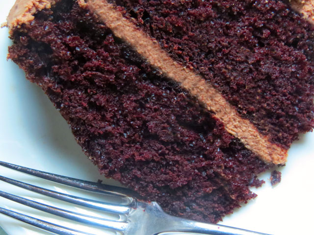 This is the cake I made for Joe’s birthday – a light, moist chocolate cake. What I loved about this cake was the frosting – melted chocolate with sour cream whipped in with the butter and confectioners sugar. It was soft in texture, and not too sweet like some frostings can be. Definitely my new go-to chocolate cake!
