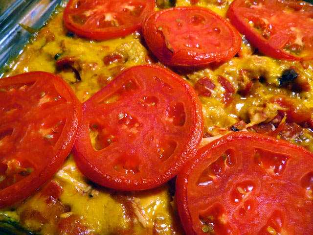 - Preheat oven to 375º. In an 8″ x 8″ baking dish, place a layer of broken tortilla chips, top with a layer of the chicken mixture, sprinkle with cheese. Repeat 2 more times. Top with sliced tomatoes.