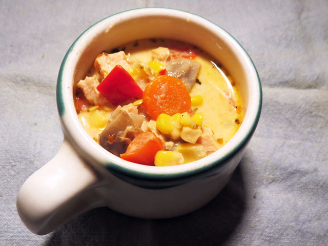 In my quest to find ways of using my remaining monster turkey, I give you Turkey Corn Soup. A slightly creamy, nutritious soup with corn, red peppers, carrots, and mushrooms. The beauty of this soup is that it can be put together in 30 minutes, and it’s delish!