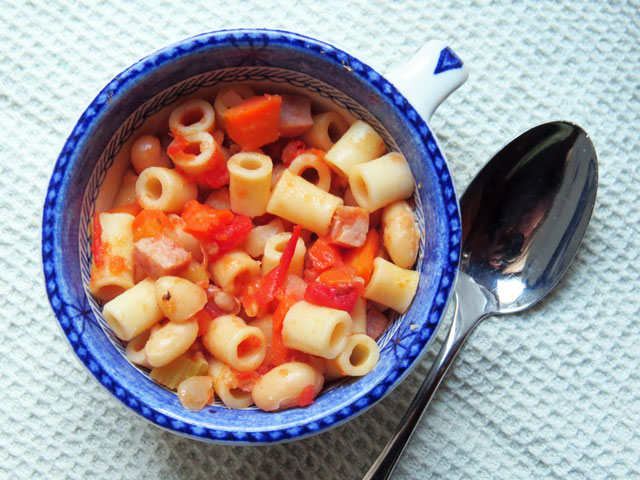 Soup is always a terrific comfort food to make for dinner when it’s snowing. Sunday was no exception – a tomato broth with ham , cannellini beans, pasta, and garlic is just what the doctor ordered! It makes 6 servings.