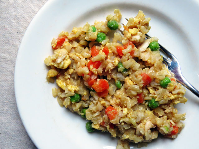 I’m always looking for ways to use up the leftover roast chicken in the fridge, and if you happen to have leftover rice – even better! This dish is definitely something you can easily throw together on a week night for dinner, and is great to take for lunch the following day.