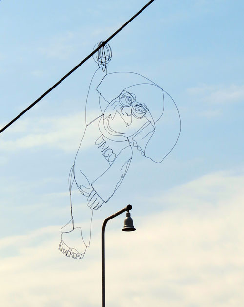 Our eagle eyed friend Tony spotted this wire sculpture hanging from the electrical line at Broad & Washington yesterday. We wondered how they got it up there?