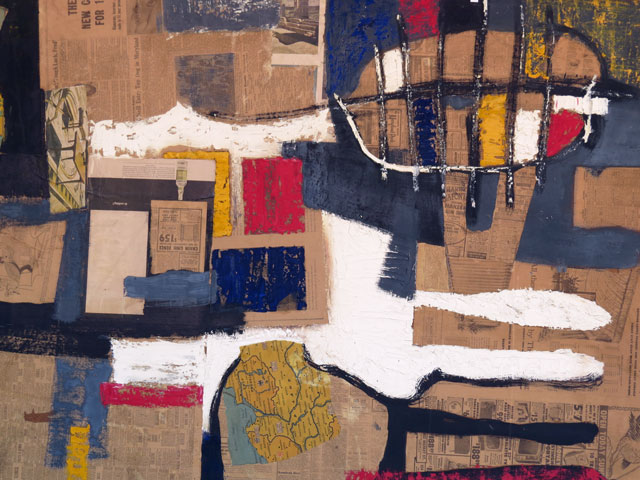 Seen on 9th Street, mixed media – old newspaper articles, maps and paint.