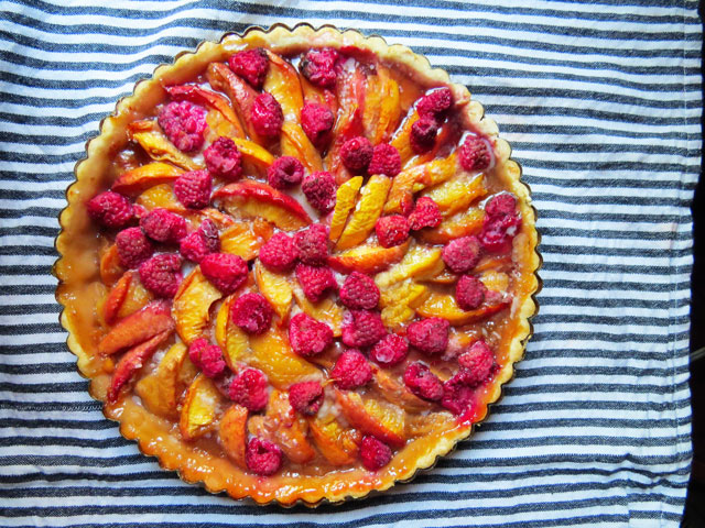 Saturday’s trip to the market yielded three pounds of small, ripe peaches – perfect for the tart I’ve been wanting to make. I also spied gorgeous half pints of raspberries, which I picked up to top off my tart. It smelled divine while baking, and tasted even better!