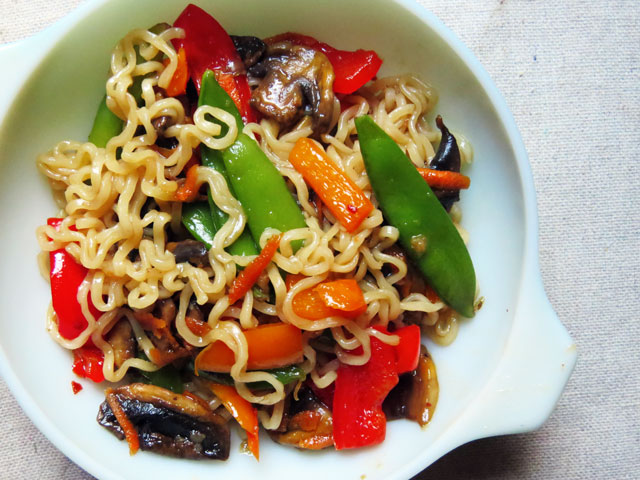 - Add the meat, vegetables, and ramen noodles into the sauce – and toss to coat. Serves four.