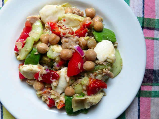 Last week, we had quite a few days of 90+ degree days around these parts. When the weather fills you with dread about making dinner, this chopped salad is a lifesaver. Mine had imported tuna in olive oil and garbanzo beans as a protein, tomatoes, avocado, cucumbers, red roasted peppers, artichoke hearts, and fresh mozzarella. Chopped salad, because you can’t serve popsicles for dinner every night!