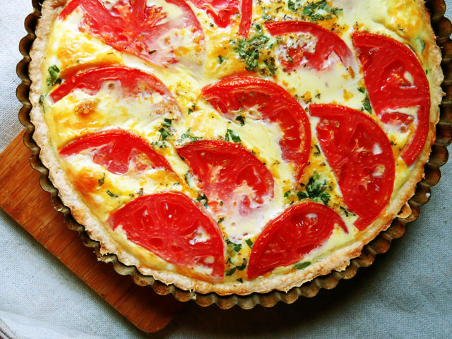 - Meanwhile, whisk the eggs, milk, cheese, herbs, and salt. Pour into shell and top with tomatoes. Bake in a 425º oven for 15 minutes, reduce oven temperature to 350º and bake for another 10 to 15 minutes until the custard is set. Serve warm.