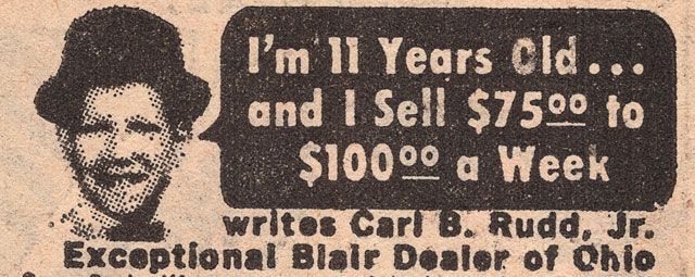 This is another one of those advertisements that ran in comics for years appealing to the entrepreneurial zeal that kids used to have a generation or so ago. This is back when if a kid wanted or needed money there were paper routes, grocery delivery or lawns to mow. They all earned chump change compared to the king’s ransom Carl B. Rudd, Jr. appears to be dragging in as an Exceptional Blair Dealer in The Buckeye State.
