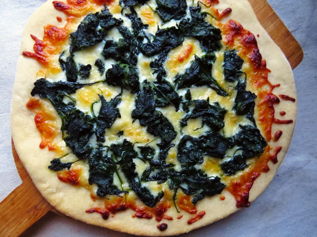 Pizza with lots of garlic and spinach fits the bill on Meatless Mondays. If you follow the recipe, you can make an amazing pizza faster than delivery, and save some dough (pardon the pun) while you’re at it!