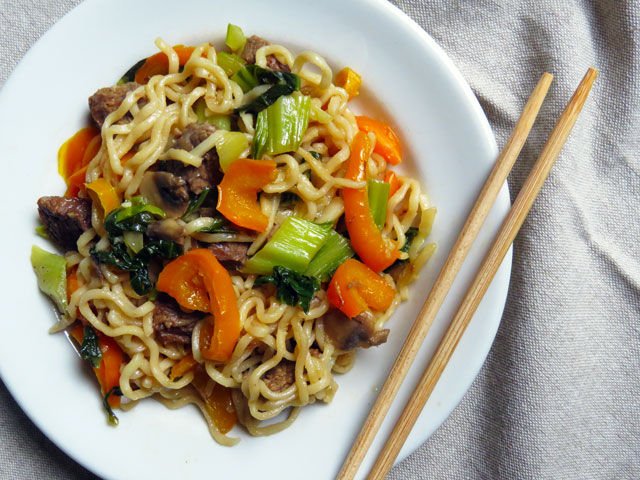 - Add ramen noodles to a pot of boiling water and cook for 4 to 5 minutes, drain. Transfer to pan with vegetables and steak.