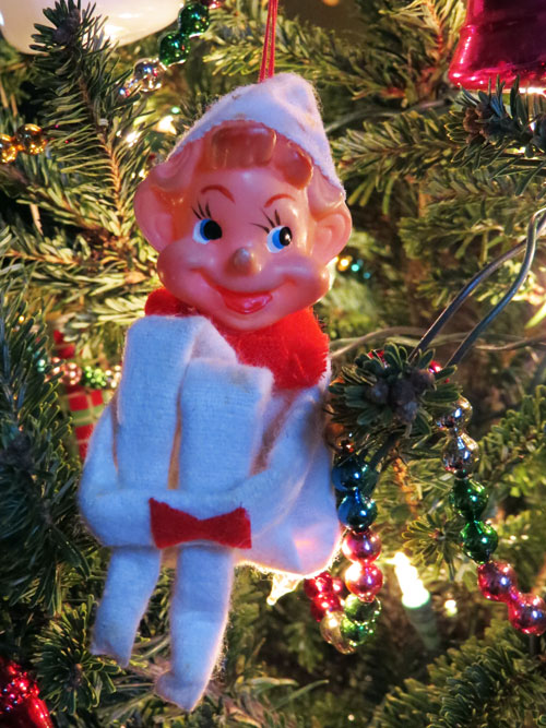 Last weekend while the Boy and I were out taking a walk, we ducked into my favorite neighborhood antique store where I spotted this elf. Of course, I had to take him home with me – and now he’s keeping company with the reindeer and the Santa figurines on our tree!