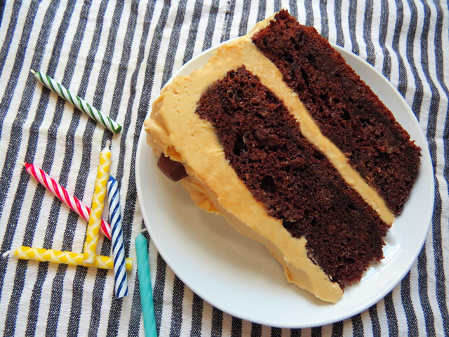 We celebrated The Boy’s birthday over the weekend with this perfect combo of rich chocolate cake and peanut butter frosting. This cake uses a Devil’s Food cake mix as a base, lots of eggs, dry pudding mix, and sour cream, the combination of which makes for a flavorful, moist cake. I used mini peanut butter cups to decorate the cake since it was a special occasion, you could also chop up peanut butter cups and sprinkle them on top if you’re so inclined!