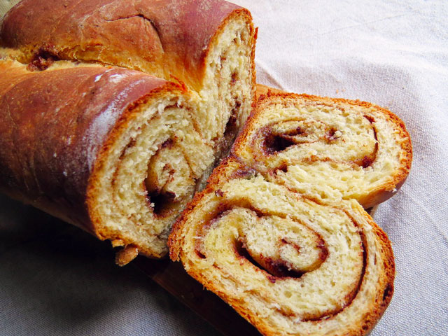 - Grease a 9″ x 5″ loaf pan. Cut dough in two portions. On a lightly floured surface, roll one portion of the dough into a 9″ x 14″ rectangle, spread half of the sugar cinnamon on the dough to the edges. Starting on the short end, tightly roll up dough – place in the loaf pan seam side down. Repeat process with the other portion of the dough.