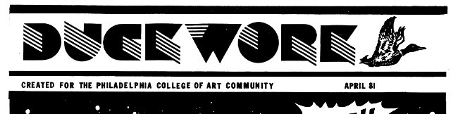 Embedded below is a PDF of the April 1981 edition of DUCKWORK which was CREATED FOR THE PHILADELPHIA COLLEGE OF ART COMMUNITY. It was a newspaper put together by PCA students for PCA students, and I found a pile of them free for the taking in the entrance of the building at 260 South Broad Street which housed most of the art school’s classes at the time. I was there on that delightful Spring day portfolio in hand nervously interviewing for my space in the Fall 1981 semester. I grabbed it either heading in or heading out; threw it into my portfolio and still have it 41 years later.