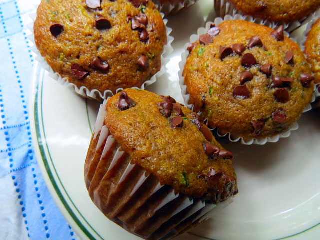 I had a hard time convincing The Boy to make zucchini muffins. He just couldn’t get over the fact that putting a vegetable in a muffin would be a good thing. He finally relented when he found out that chocolate chips were part of the recipe. Needless to say, he’s a fan!