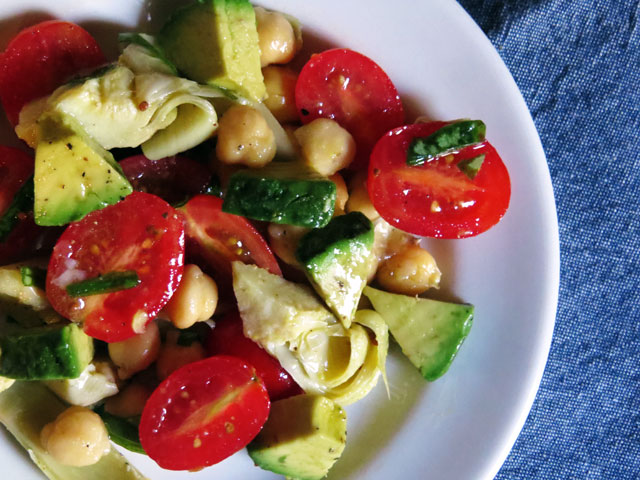 - In a medium bowl, combine tomatoes, artichoke hearts, chickpeas, and avocado.