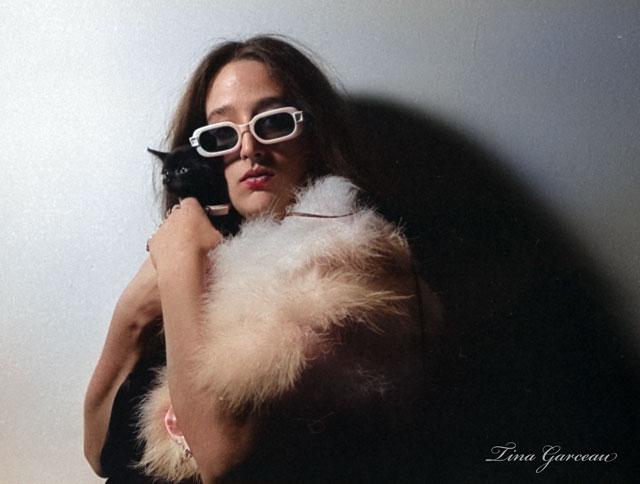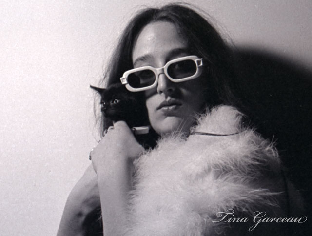Illustration majors at the school formerly known as The Philadelphia Collage of Art were required to take a photography elective where students would shoot 35mm film; process the film and make prints from the negatives. One of the assignments was a to shoot a self portrait. I had the same assignment when I did the elective, and I think I did a couple of overly self conscious shots whereas Tina had fun with dramatic lighting, a number of poses and a few costume changes. As you can see in this shot she grabbed a black kitten as a fashion accessory which makes this a Caturday post!.