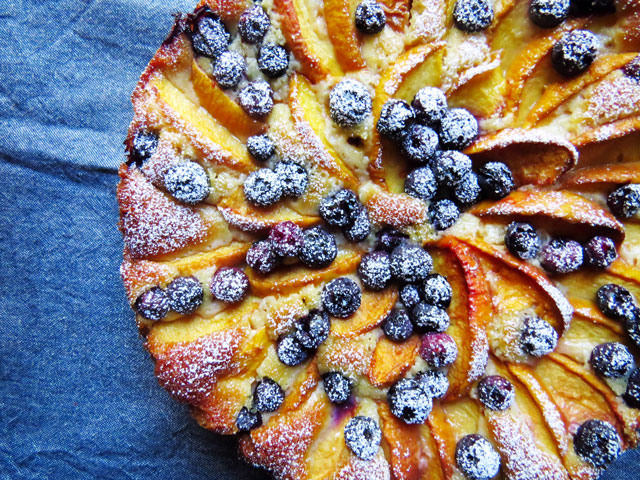 The peaches were just gorgeous in the market this weekend, as were the blueberries. I didn’t have time to make a pie, so I threw together this simple cake made with yogurt and topped with fruit. It was perfect with coffee this morning!