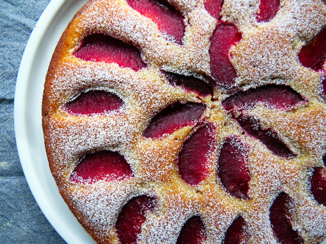 The temperatures are beginning to drop a little, which means that fall will be here before you know it. Arrivederci to the peaches, strawberries, and blueberries that graced my pies, cakes, and muffins this summer – I’m looking forward to stone fruits, apples, and pears. This plum cake is simple to make, delicious, and I’m loving the jewel toned fruit on top!