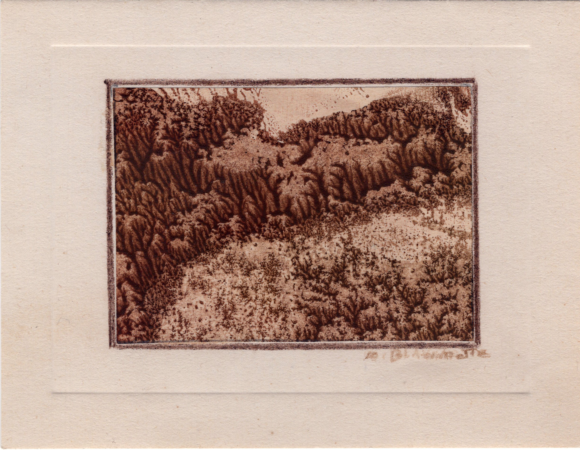 Her method was dipping a palette knife in paint and dragging it across a sheet of paper. Miss Blanchette would look at the results – this appeared to be a landscape – she then went back in with a brush and worked on it. The final, which was about the size of a business card – was cropped, glued to a piece of paper, and signed. I adore the beachy vibe of this composition. This technique of painting is what I refer to as “Happy Accidents”, and could easily be a rainy day project with kids.