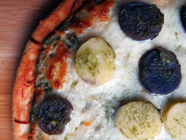 - Spread the pesto on the pizza shell, top with mozzarella and potato slices. Bake for 15 minutes, check the bottom of the pie to make sure it’s golden.