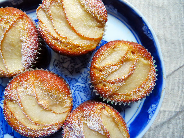 - Divide the batter evenly between the muffin papers, and fan three slices of the pear on top of each. Bake for 20 minutes, muffins should be lightly golden – test with a toothpick. Serve at room temperature.