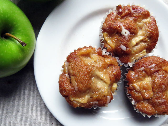 2. Sift together flour, baking soda, cinnamon, nutmeg and salt and gradually add to the sugar and eggs, mixing just until well-blended. Stir in the apples, and vanilla and divide among the muffin cups.