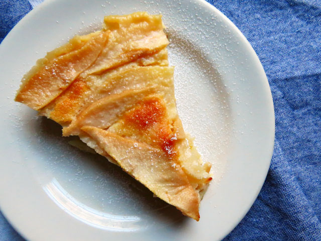 This is a modest, crustless pie that’s packed with fruit. The custard is made in a blender, then poured over a pan of sliced pears and baked. Simple, but a beautiful dessert!