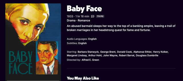 Baby Face was yanked from the Internet Archive, but it is available as of this writing to view legally in the USA at TubiTV. Check it out HERE!