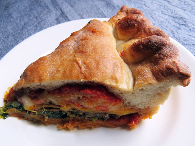 My inspiration for making a vegetable calzone came from a crate of broccoli rabe I spied at the market. I adore broccoli rabe, and wanted to make an entree that made it the star of the show. I added baby eggplant, roasted red peppers, and sautéed mushrooms to the mix, along with mozzarella and marinara – baked in a pizza crust. It was delicious and reheated nicely the following day!