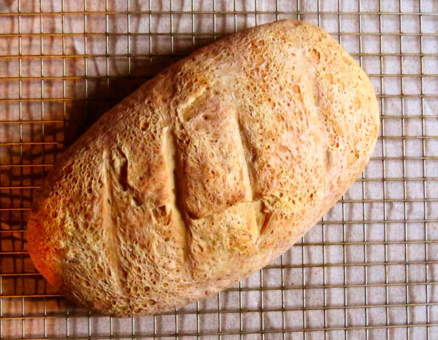 - Bake for 10 minutes at 425º, then lower the temperature to 400º and bake for another 30 to 35 minutes. Tap on the bottom of the loaf, if it sounds hollow, it’s done. Cool on a wire rack until it’s no longer hot. Enjoy!