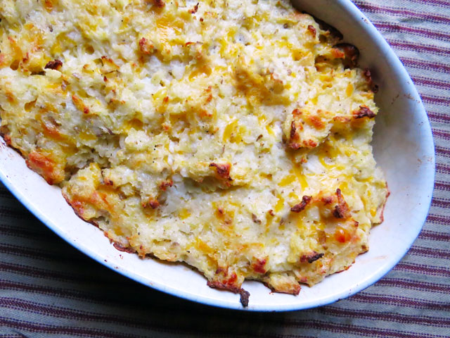 - Preheat oven to 425º, Grease a casserole dish with butter. Using the large holes of a box grater, shred the potatoes with skins on into a large bowl.